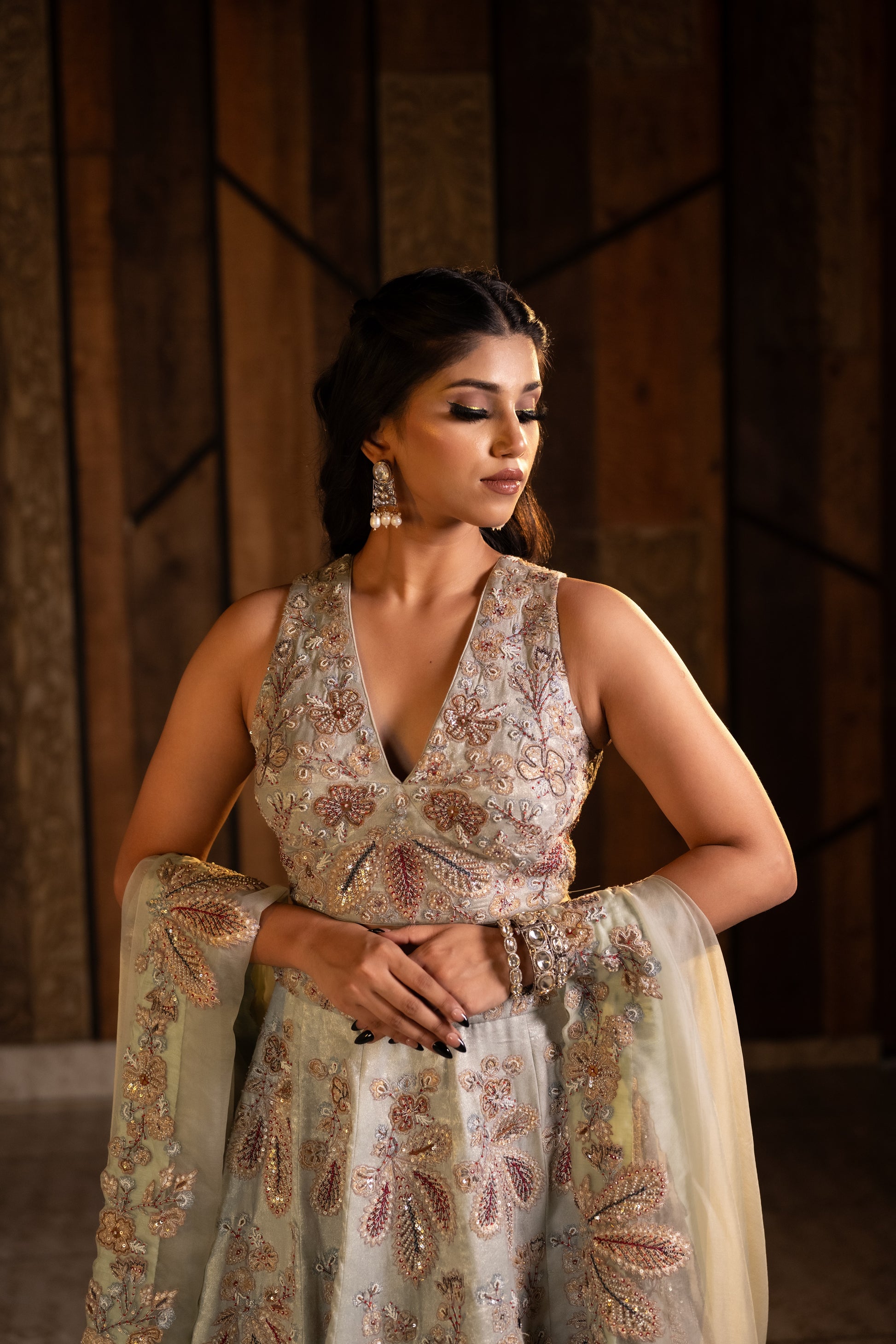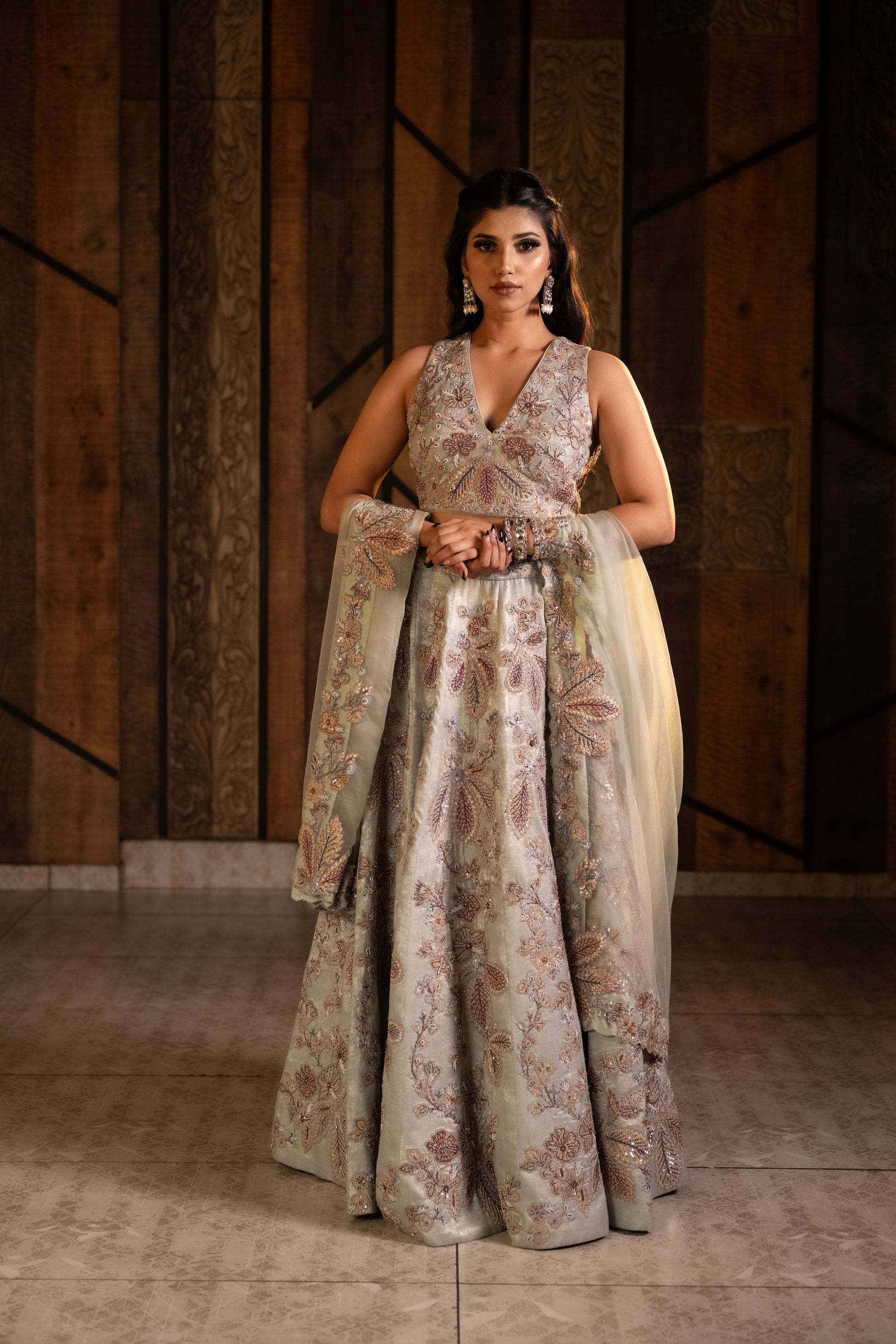 Embrace serenity in the ice-mint green organza lehenga set, graced with the finesse of thread and zardozi work. This serene color palette mirrors renewal, while opulent embellishments echo a story of tradition, craftsmanship, and prosperity.