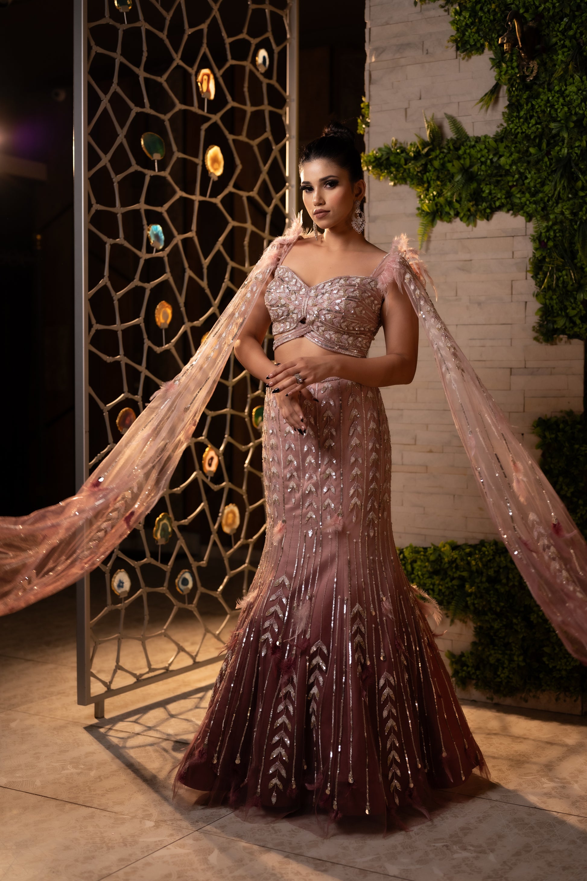 An Exotic Champagne Ombre Fish Cut Lehenga Set