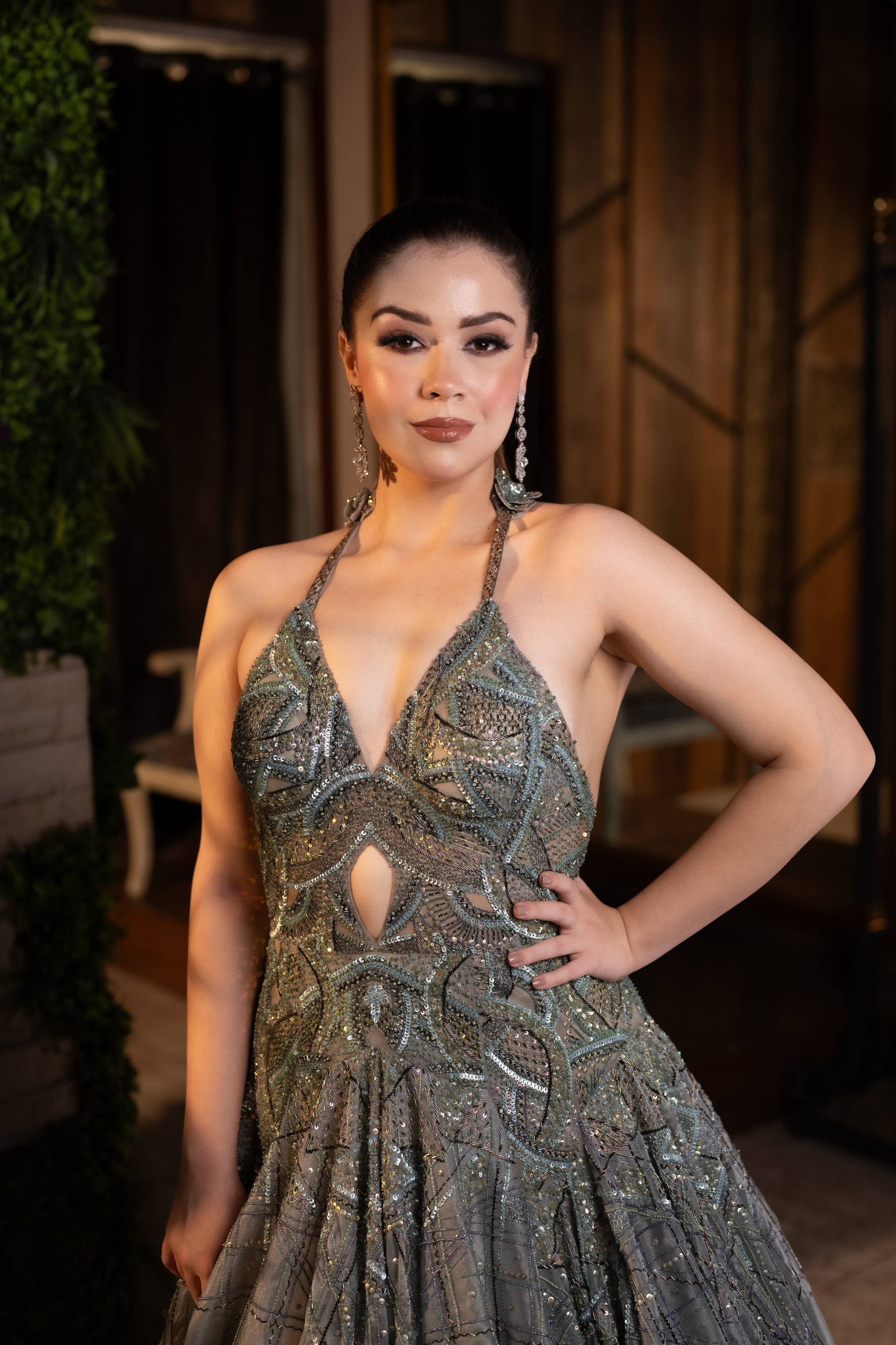 Immerse yourself in the ethereal allure of organza as this gown drapes gracefully in a silver hue that exudes refinement. The sleeveless design adds a contemporary touch, allowing the spotlight to linger on the exquisite details that make this gown a masterpiece.