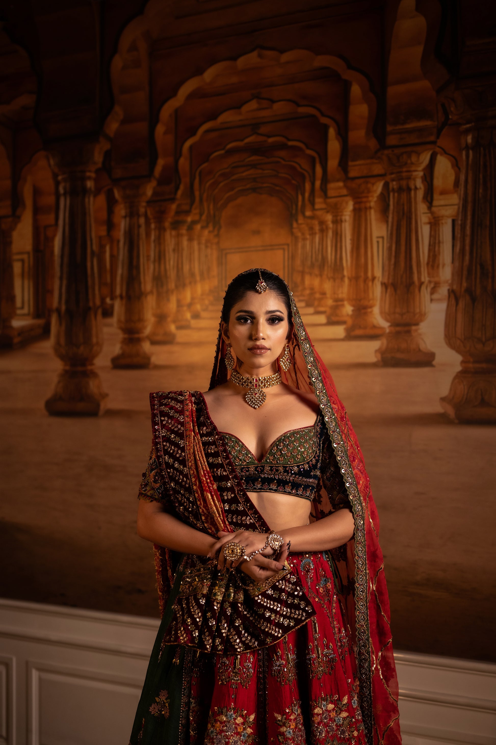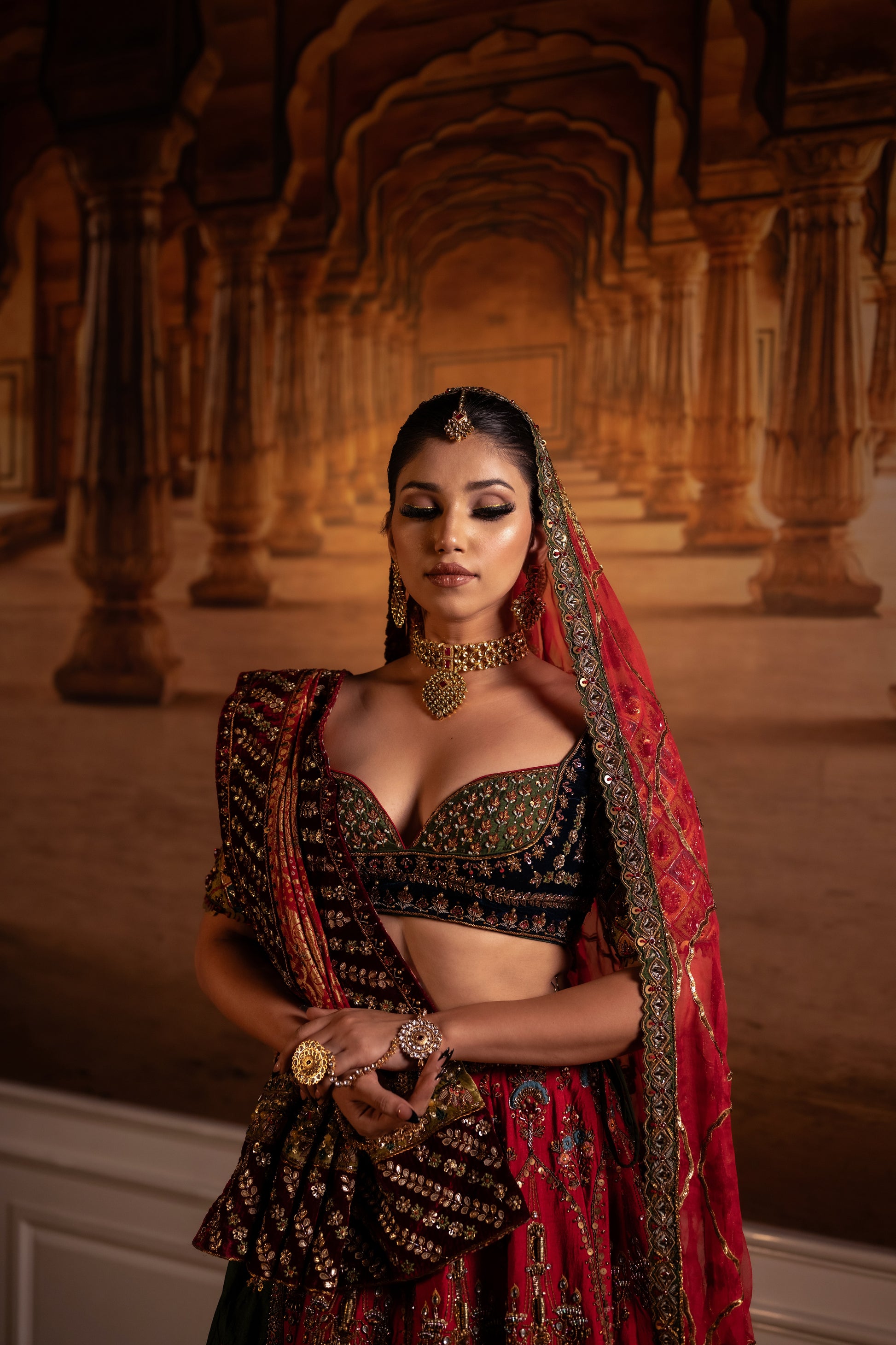 - Components: 4 Piece Tomato Red Colored Skirt With Overlapping Emerald Green, Dupatta Red